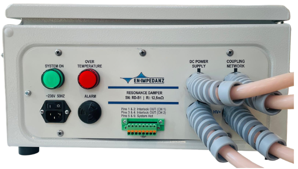 Resonanz-Dämpfungsglieder werden zur Dämpfung und Verschiebung von Resonanzen innerhalb von Testaufbauten eingesetzt. Damit wird sichergestellt, dass zwischen den HV-Komponenten auftretende Resonanzen gedämpft werden und die erforderlichen anliegenden Störgrößen am Prüfling erreicht werden.